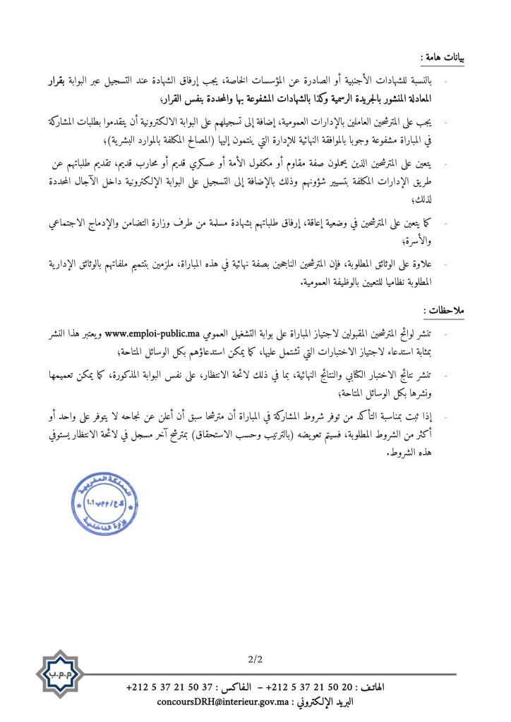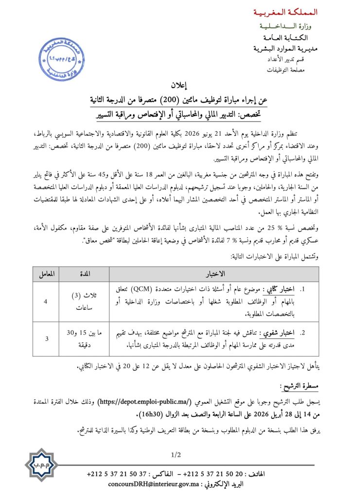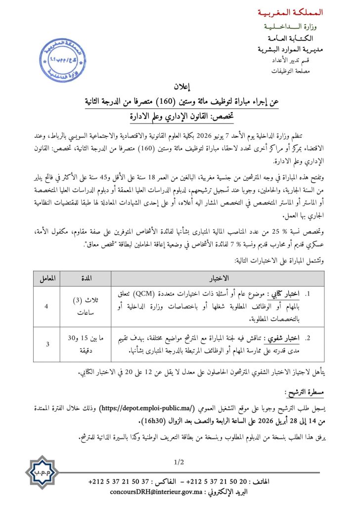 إعلان رسمي: فتح مباراة لتوظيف 600 موظف بوزارة الداخلية 2026