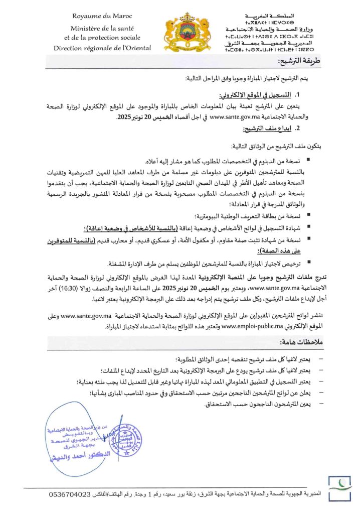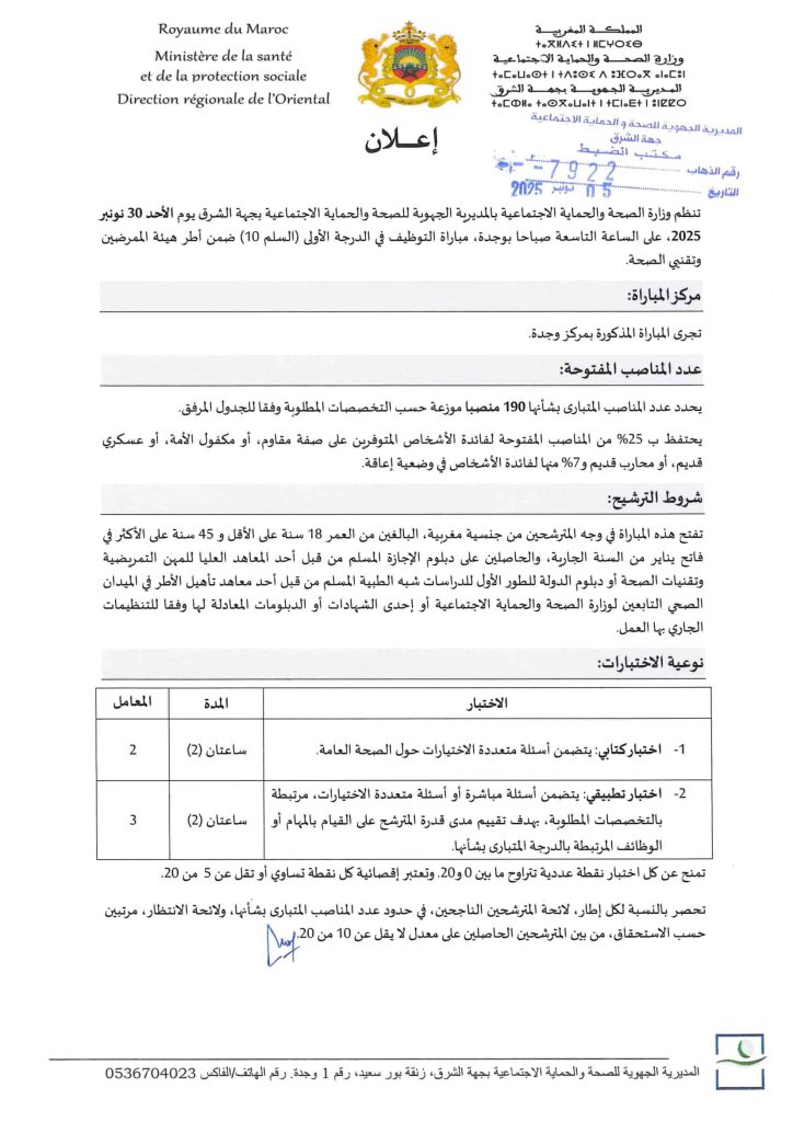 أعلنت المديرية الجهوية للصحة والحماية الاجتماعية بجهة الشرق عن فتح باب الترشيح للمشاركة في مباراة توظيف 190 منصبًا في مختلف تخصصات التمريض والتقنيات الصحية، وذلك في إطار سعيها إلى تعزيز الكفاءات البشرية بقطاع الصحة والارتقاء بجودة الخدمات المقدمة للمواطنين.