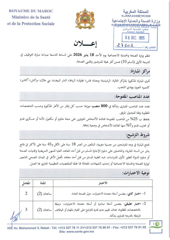 Le Ministère de la Santé et de la Protection Sociale annonce l’ouverture d’un concours national visant le recrutement de 800 Infirmiers et Techniciens de Santé, dans le cadre du renforcement des équipes médicales au sein du secteur de la santé publique. Ce concours couvre plusieurs spécialités et s’adresse aux professionnels souhaitant contribuer à l’amélioration des services de soins à l’échelle du Royaume.